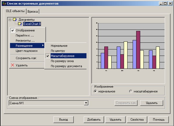Комбинации, при которых отображаются те или иные OLE-объекты, могут быть сохранены в схемы отображения. Кнопка Сохранить предназначена для сохранения схемы отображения, а кнопка Удалить - соответственно для удаления схемы.