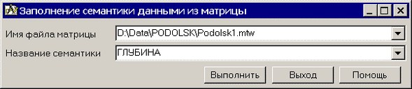 В диалоге необходимо указать из какой матрицы необходимо брать данные, а также, какую семантическую характеристику необходимо добавить и заполнить информацией из матрицы. При заполнении семантической характеристики значение из матрицы считывается по координатам центра объекта. При выборе матрицы пользователь получает доступ к списку матриц высот и матриц качества. Для того чтобы занести значение из матрицы слоев необходимо предварительно сформировать матрицу исследуемого качества (например, мощность слоя).