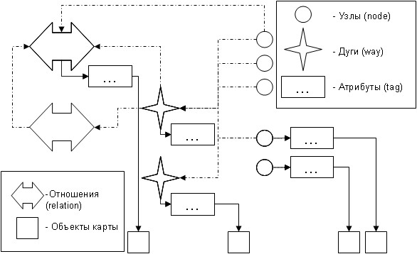 Дуги (way) - набор узлов. Могут быть самостоятельными объектами (при наличии описательных тегов), а так же входить в состав отношений. Например: <way id="8880955" version="4" timestamp="2018-08-18T14:17:53Z" changeset="0"> <nd ref="64796309"/> <nd ref="64796310"/> <tag k="waterway" v="riverbank"/>