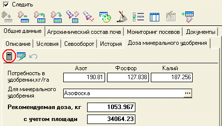 Вызов диалога для текущего поля «Расчет годовых доз минеральных удобрений»: