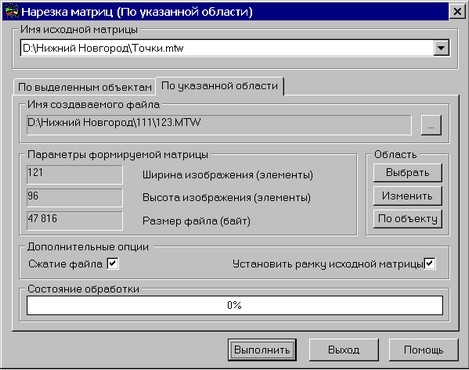 Для выбора фрагмента необходимо нажать кнопку Выбрать диалога Нарезка матрицы, затем отметить область на карте выбором двух  точек, диалог Нарезка матрицы откроется повторно.