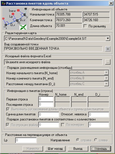 Диалог Расстановка пикетов вдоль объекта (Excel) |