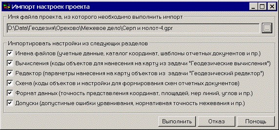 Данный диалог используется для переноса настроек из одного проекта в другой. Выполнение операции начинается с указания имени файла проекта, из которого необходимо выполнить импорт, установить разделы для импортирования и нажать кнопку «Выполнить». Программа позволяет управлять импортом в соответствии со страницами диалога «Параметры проекта для геодезии и формирования землеустроительной документации». При импорте необходимо учитывать ряд ограничений. Классификаторы карт, текущего и импортируемого проектов должны совпадать. В случае несовпадения классификаторов может произойти некорректная настройка кодов объектов. Файлы таблиц «Учетные данные» и «Каталог координат» должны существовать. При их отсутствии программа поставить пустую сточку.