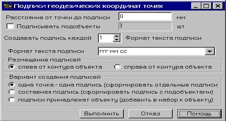 ic_0127 В результате выполнения операции происходит создание подписи геодезических координат каждой поворотной (угловой) точки указанного на карте объекта. Выполнение данного режима возможно только для карт, поддерживающих геодезические параметры (проекция, осевой меридиан и т.п.). После нажатия на соответствующую кнопку, пользователю необходимо указать на карте объект, геодезические координаты поворотных точек которого нужно подписать. Возможен выбор линейного или площадного объекта. Создание подписей происходит в соответствии с кодом, указанным в параметрах настройки. Задача функционирует в режиме диалога.