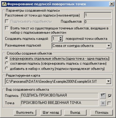 В результате операции происходит создание подписи поворотной точки указанного на карте объекта. Поверх поворотных точек объекта могут создаваться точечные объекты указанного вида с заполнением семантической характеристики «Собственное название».