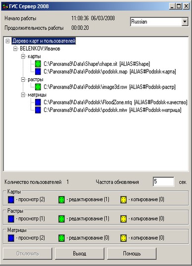 В конце списка указывается число подключенных пользователей и статистика по каждому виду открытых данных. Сведения на главной форме обновляются с заданной частотой. При запуске программы частота обновления равна 5 секунд. Пользователь программы может установить другое значение. Вся текстовая информация отображается на том языке, который выбрал пользователь в списке языков. Список поддерживаемых языков и тексты всех сообщений на разных языках хранятся в текстовом файле GISSERVER.INI. Для выполнения локализации программы этот файл может быть дополнен.