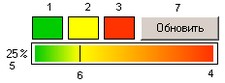 Палитра изображения является двухинтервальной, то есть в формировании палитры участвуют три цвета: начальный (1), промежуточный (2) и конечный (3). Распределение цветов в палитре показано в цветовой шкале (4). Граница цветовых интервалов задается в % к общей длине шкалы (5). Ее положение указано на шкале (6). Изменить положение границы интервалов можно, указав ее новое положение на цветовой шкале. Если Вам необходимо использовать одноинтервальную шкалу (например, если Вы хотите, чтобы цвет у Вас изменялся от синего до красного, без промежуточного цвета), передвиньте указатель границы интервалов в крайнее правое положение и используйте для настройки изображения только начальный и промежуточный цвета. Изменить начальный, промежуточный и конечный цвета можно выбрав мышью соответствующий прямоугольник. После изменения параметров цветовой палитры переформирование изображения автоматически не производится. Для приведения в соответствие изображения модели настроенной Вами цветовой палитре, следует нажать кнопку Обновить (7). После настройки всех параметров изображения следует нажать кнопку Сохранить. В случае, если Вы указали имя существующего (в том числе и уже добавленного в электронную карту) файла растрового изображения, он будет заменен. Формирование растрового изображения производится путем копии экранного изображения модели, а шаг формирования модели – фиксированное число. Поэтому точность (зернистость) полученного в результате изображения зависит от разрешения Вашего монитора и площади выбранного Вами участка. Если Вы хотите получить более точное изображение, следует выполнить построение изображения «по частям» (последовательно построить изображение на отдельные участки карты). Однако отдельные участки следует формировать с идентичными параметрами изображения (вертикальный масштаб, параметры освещения и цветовая палитра). Кроме того, участки должны быть приблизительно одного размера. Визуальные параметры (палитра и вертикальный масштаб) можно сохранить