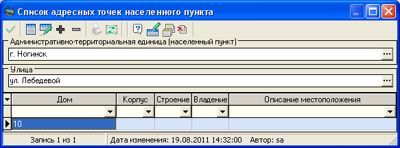 Для описания адресной точки необходимо заполнить: - Дом – дом, буква. - Корпус – корпус. - Строение – строение. - Владение – владение. - Почтовый индекс - почтовый индекс. - Описание местоположения – описание местонахождения адресной точки. - Статус – статус адресной точки – признак действующего адресного объекта – не определен/действующий/временный/архивный. Заполняется из выпадающего списка. Если адресная точка указана, как неопределенная или архивная, то в списке она не отображается. Обязательно для заполнения. - Примечание – дополнительная информация об адресной точке.