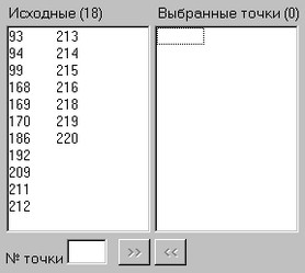 Чтобы выбрать необходимые для работы точки, надо подсветить нужные точки и перекинуть их из первого окна во второе с помощью кнопки ">>". Аналогично лишние точки перекидываются из второго окна в первое (с помощью кнопки "<<"). Кроме того, можно вводить номер опорной точки вручную с клавиатуры в окошке № точки. При этом если такая точка в окне Исходные точки есть, то она подсвечивается, и ее можно перекинуть в соседнее окно по клавише Ввод клавиатуры, либо с помощью кнопки ">>". Если набранного номера точки нет, то выдается сообщение об этом.