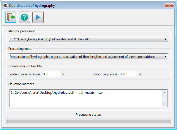 — Adjustment of elevation matrices. At this stage, heights from hydrography objects are transferred to elevation matrices. Heights near hydrography objects are smoothed if a smoothing radius is specified.