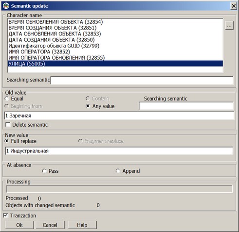 - Use Search and mark dialog to define a list of processed map objects and press Mark button. - Activate semantics replacement mode by pressing of the appropriate button of Semantic subpanel in Map editor. - Define a name of the changed characteristic, its old and new value.