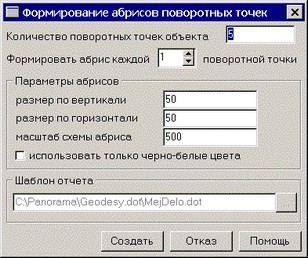 Состав страниц диалога, определяется по типу исходного режима, инициализировавшего вызов. Только те режимы, которые предназначены для формирования описания землеустроительного дела, дают команду диалогу отображать страницу кадастровая история. После установления всех параметров формирования нажмите кнопку Создать. Если установлен флаг «Создавать абрисы поворотных точек участка», то перед формированием схемы появится диалог Формирование абрисов поворотных точек