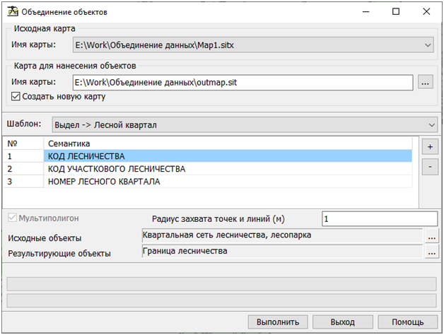 - выбрать из списка карт требуемую карту; - выбрать из списка или создать новую карту для нанесения объектов; - составить список семантик, по значениям которых будет производиться объединение; - выбрать тип исходных объектов; - выбрать тип результирующих объектов; - нажать кнопку «Выполнить».