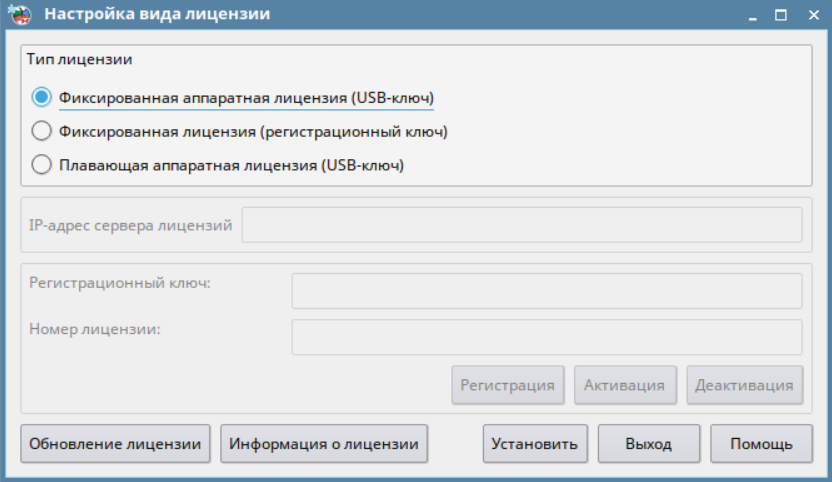 В диалоге «Настройка вида лицензии» выбрать тип «Фиксированная аппаратная лицензия (USB-ключ)» и нажать кнопку «Установить». Для закрытия диалога «Настройка вида лицензии» нажать на кнопку «Выход». |