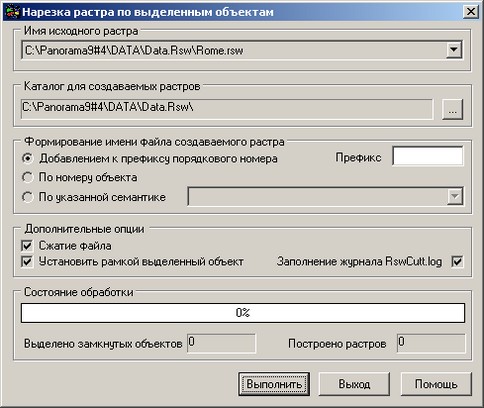 Режим предназначен для нарезки растра по выделенным объектам. Обрабатываются замкнутые линейные и площадные объекты. Создаваемые растры добавляются в документ.