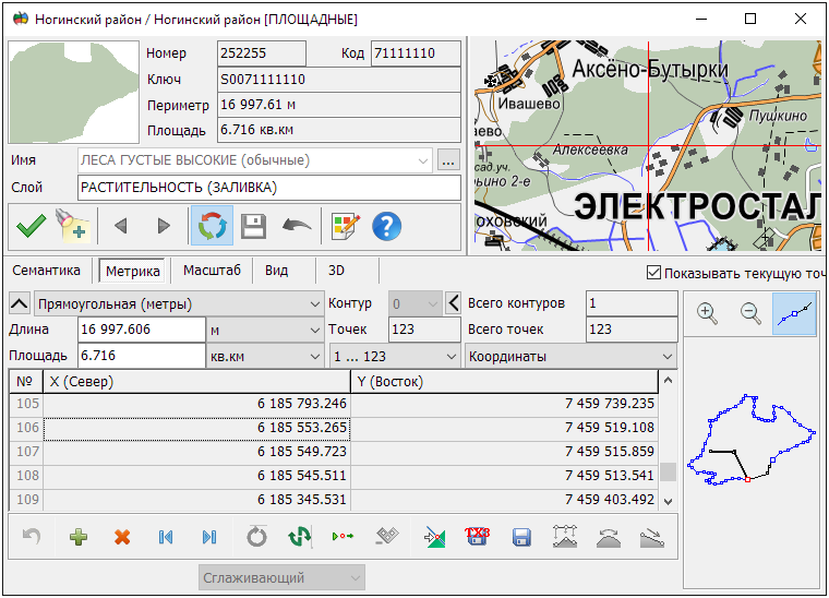 Отображение метрики объекта (подобъекта) включает ряд статистических характеристик, а также координаты и высоты его точек и схематическое отображение контура. Отображаются следующие характеристики объекта (подобъекта): - количество подобъектов объекте; - номер отображаемого подобъекта(объектимеетномер0); - количество точек в объекте (подобъекте); - расстояние между текущей и следующей точкой объекта (подобъекта); - дирекционный угол или азимут от текущей к следующей точке объекта (подобъекта).