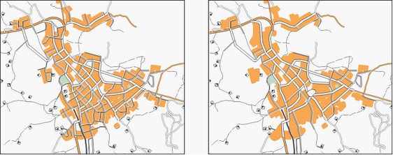 На рисунке: слева - исходное изображение сети дорог, справа - результат выполнения автоматического разрежения дорожной сети. |