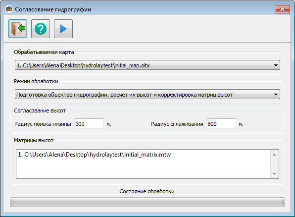 Инструмент Согласование объектов гидрографии и матриц высот предназначен для формирования высот в узлах объектов гидрографии с учётом направлений течений на основе матриц высот с последующей корректировкой матриц.