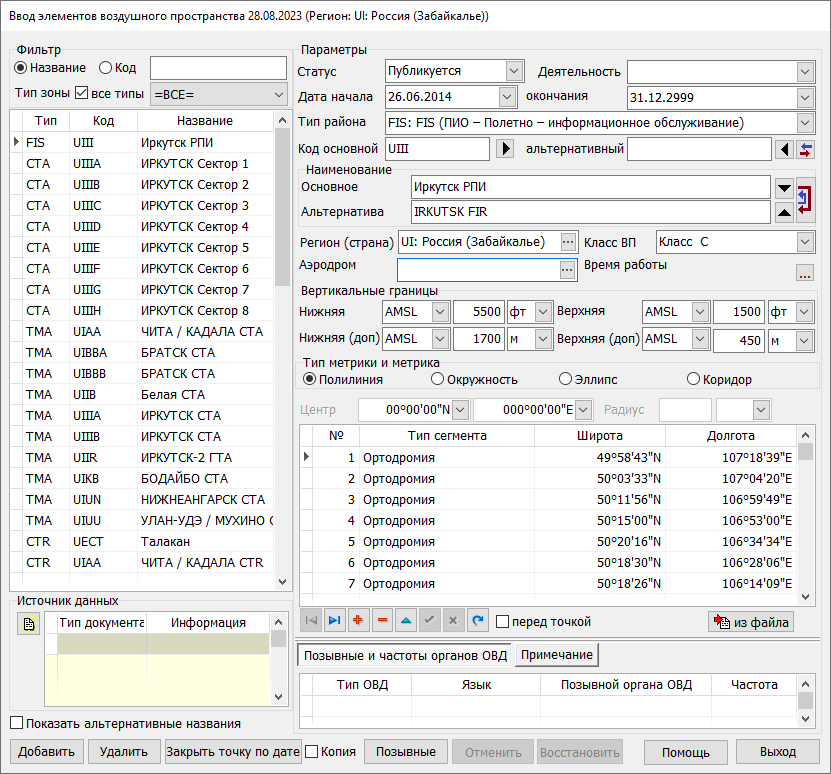 В левой части формы размещается список элементов воздушного пространства. Жёлтым цветом отображаются записи, которые планируются. В верхней части левой панели размещен фильтр, который служит для поиска по названию / коду и типу зоны. Флаг «все типы» служит для возможности работы с основными типами районов ОВД или всеми доступными согласно спецификации AICM. При включённом флаге выпадающий список будет содержать все возможные типы элементов воздушного пространства, за исключением запретных и опасных зон, при снятом флаге — только основные, указанные выше по тексту. В нижней правой части располагается панель «Источник информации». Таблица служит для отображения источников информации о текущем элементе воздушного пространства. Кнопка «Закрыть» предназначена для установки даты окончания действия элемента воздушного пространства, что приводит к закрытию по дате. На текущий элемент воздушного пространства устанавливается дата, на день раньше даты, установленной в настройке задачи. При установленном флаге «Копия», выполняется копирование текущего элемента воздушного пространства, начиная с установкой даты, указанной в настройках задачи. Кнопка Флаг «Показать альтернативные названия» позволяет изменить содержимое полей таблицы и позывных на альтернативные (английские/русские) названия. Правая часть — панель редактирования характеристик объекта. Поле «Параметры» — наименование, кодовое обозначение, тип (из перечня — см. выше), деятельность, время работы, класс воздушного пространства, вертикальные границы. При необходимости выбирается связанный аэродром в диалоге, который вызывается при нажатии кнопки «…» в поле «Аэродром». Превышение выбранного аэродрома будет служить опорной высотой при выводе зоны или района ОВД на карту в режиме «Относительные высоты». От верхней и нижней границы будет вычтено превышение аэродрома, а результат округлен в большую сторону до 10 метров. С высот UNL и GND высота аэродрома не вычитается. Если разница высоты будет менее 0, значение приводится к GND. Поля «Вертикальные границы» — «Нижняя (дополнительная)», «Верхняя (дополнительная)» предназначены для заполнения информации во второй системе измерения высот (например, метры и футы). При нанесении объекта на карту возможно формирование значений семантики верхней и нижней границы высот элементов ВП («Минимальная высота» (20), «Максимальная высота» (21) классификатора dfc.rscz) в метрах, в футах, в метрах и футах. Диалог оснащён фильтрами по коду и названию аэродрома. Выбор осуществляется кнопкой «Выбрать».