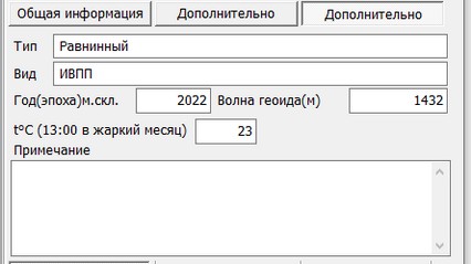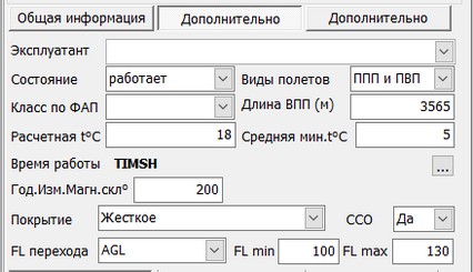Панели «Дополнительно» служат для ввода следующих данных: Поле «Эксплуатант» — старший авиационный начальник (эксплуатант) ; Поле «Состояние» — состояние активности аэродрома (работает, закрыт и другие); Поле «Тип полётов» — правила полётов, принятые на аэродроме; Поле «Класс по ФАП» — рассчитанный класс аэродрома; Поле «Длина ВПП (м)» — только для чтения. Предназначено для отображения значения самой длинной ВПП в метрах. Список ВПП аэродрома формируется с помощью диалога «Ввод инфраструктуры аэродрома» (Вкладка «ВПП»). Поле «Покрытие» — содержит список значений покрытия для выбора (жесткое, нежесткое, смешанное). Поле «Год.Магн.скл °» — содержит годовое магнитное склонение; Поле «Год.Изм.Магн.скл °» — содержит годовое изменение магнитного склонения; Поле «Год(эпоха) м.скл.» — дата информации о магнитном склонении (эпоха); Поле «Волна геоида (м) .» — волна геоида в месте превышения аэродрома (м); Поле «Тип» — тип аэродрома, например, равнинный; Поле «Вид» — вид аэродрома (по виду поверхности ВПП); Поле «FL перехода» — эшелон перехода аэродрома. В выпадающем списке указывается система отсчёта, в полях «FL min» и «FL max» минимальное и максимальное значения в эшелонах. Поле «Расчетная t°C» — расчетная температура аэродрома; Поле «Средняя мин. t°C» — средняя минимальная температура по многолетним наблюдениям; Поле «t°C (13:00 в жаркий месяц)» — средняя температура в 13:00 местного времени в самый жаркий месяц в году для местности; Время работы устанавливается кнопкой