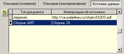 Поле «Примечания» содержит поле для ввода примечания к аэродрому. Ниже размещена панель, содержащая три вкладки. Вкладка «Описание (основное)» служит для ввода произвольного текстового описания (ремарок) позиций объектов или субъектов аэропорта на основном языке. Вкладка «Описание альтернативное» служит для ввода произвольного текстового описания (ремарок) позиций объектов или субъектов аэропорта на альтернативном языке. Обе вкладки полностью дублируют все поля, за исключением места хранения информации. Вкладка содержит следующие поля: — «КТА» — описание положения контрольной точки аэропорта; — «аэродрома от нас.пунктов» — положение аэродрома по отношению к ближайшим крупным населённым пунктам; — «высотомера» — описание наличия и положения высотомера; — «электроагрегатов» — описание наличия и порядка эксплуатации источников вторичного электропитания; — «указатель ветра» — описание наличия, размещения и вида указателей ветра; — «указатель посадки» — текстовое описание указателей посадки (огней PAPI, специальной разметки или другого оборудования). Каждое поле содержит кнопки Вкладка «Источник данных» содержит источники информации о текущем аэропорте. Кнопка