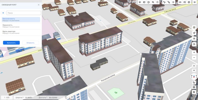 Для включения режима необходимо выбрать пункт «Свободный полет» При включении кнопки управления выводится диалоговое окно «Выбор маршрута полета». Для начала полета необходимо выбрать маршрут в таблице и нажать кнопку «Выполнить». Таблица содержит список предустановленных маршрутов полетов. Пользователь имеет возможность загрузить собственный маршрут из файла в формате GeoJSON. Для загрузки необходимо нажать кнопку «Добавить» и выбрать файл.