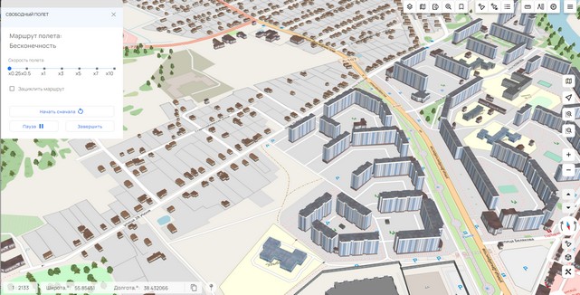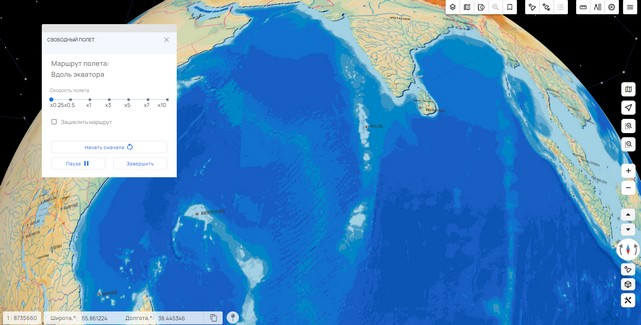 После активации режима имеется возможность изменения скорости полета в диапазоне от х0,25 до х10. При установленном параметре «Зациклить маршрут» по достижении конечной точки, полет будет продолжен с первой точки маршрута.