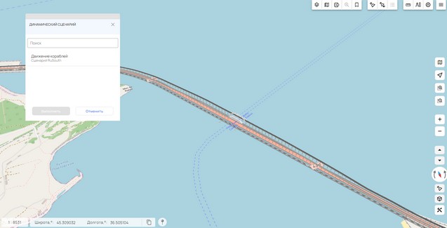 Для включения режима необходимо выбрать пункт «Динамический сценарий» При включении кнопки управления выводится диалоговое окно «Выбор сценария». Для начала воспроизведения необходимо выбрать сценарий в таблице и нажать кнопку «Выполнить». Таблица содержит список предустановленных сценариев.