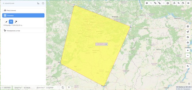 Для измерения площади необходимо нажать кнопку «Площадь» и кликом мыши указать точки измеряемой площади. При этом в окне карты отобразится полигон и значение выбранной площади. Можно изменять положение точек, добавлять новые точки или удалять лишние. При этом площадь будет пересчитываться.