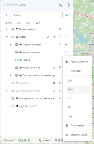 Инструмент «Скачать слои» позволяет скачивать через браузер данные слоя в указанном формате. Чтобы перейти в режим скачивания, необходимо в компоненте «Состав карты» открыть меню слоя, выбрать пункт «Скачать» и указать требуемый формат данных. После выполнения операции на сервере в браузере пользователя начнётся скачивание файла с данными. Поддерживается выгрузка файлов следующих форматов данных: — GML – текстовый файл в формате application/gml+xml; — JSON – текстовый файл в формате application/json; — SXF – архив в формате application/zip, который содержит файл данных с расширением sxf и соответствующий классификатор карты; — TXF – архив в формате application/zip, который содержит файл данных с расширением txf и соответствующий классификатор карты. — CSV – архив в формате application/zip, который содержит файл данных с расширением txt и соответствующий классификатор карты.