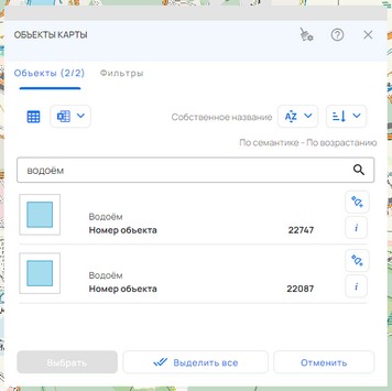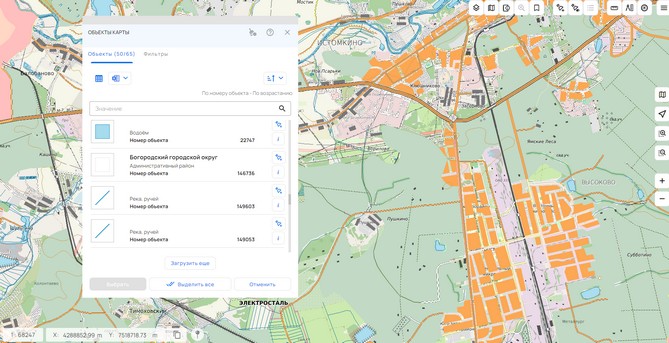 Электронная карта имеет многослойную структуру, поэтому несколько объектов могут одновременно располагаться в точке. В окне диалога отображается информация обо всех объектах в указанной точке. В панель «Объекты карты» загружается информация о первых пятидесяти объектах, если размер ответа превышает предельное значение 50. Оставшиеся объекты можно получить, нажав на кнопку «Загрузить еще» в конце списка. Количество загруженных и найденных объектов указано в заголовке вкладки Объекты Тип и направление сортировки объектов назначается в меню «Сортировать» Поле «Значение» используется для быстрого поиска по всем найденным объектам.