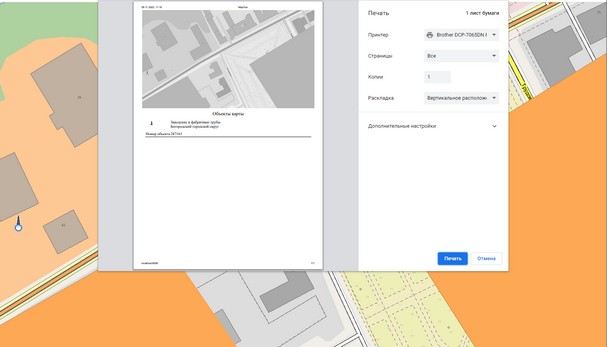 Для вывода на печать произвольного участка карты необходимо включить кнопку «Область печати» и выбрать мышкой требуемый фрагмент карты. Для изменения масштаба изображения карты при печати необходимо выбрать масштаб печати из списка «Масштаб карты». К рисунку карты при печати можно добавить собственный комментарий. Совместно с рисунком карты можно напечатать информацию об объектах карты. Для печати информации об объектах необходимо выполнить отбор объектов карты, чтобы панель «Объекты карты» отобразилась. Активировать режим «Печать карты», включить кнопку «Объекты карты» и выполнить печать. На печать выводятся данные выбранного объекта, если в карте отображается окно «Информация об объекте». Если в карте отображается список объектов «Объекты карты», данные всех объектов выводятся на печать. Шаблон вывода информации об объекте содержит название объекта, изображение вида объекта, отображаемые характеристики объекта (только для выбранного объекта). Для вывода данных на принтер необходимо выбрать пункт «Принтер» и нажать кнопку «Печать». Для вывода рисунка карты в файл необходимо выбрать пункт «Сохранить как PNG» или «Сохранить как JPG» и нажать кнопку «Печать».