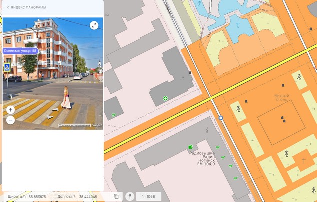 В соответствии с условиями использования API Яндекс.Карты для работы необходимо получить API ключ Яндекс. Для работы режима требуется подключение к сети интернет. Для просмотра Панорамы необходимо включить кнопку «Яндекс панорамы» и указать точку на карте. Окно панорамы откроется, если для выбранной точки имеются данные изображений. Точка обзора панорамы будет отмечена на карте GIS WebServer SE знаком
