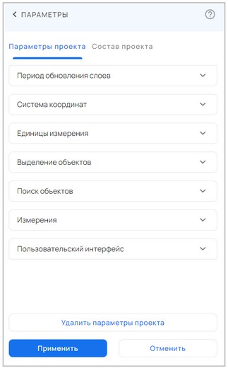 Режим «Параметры» используется для настройки интерфейса страницы пользователя. С его помощью можно устанавливать единицы измерения пространственных характеристик объектов карты, настроить параметры выделения объектов, установить период обновления слоев карты. Окно «Параметры» содержит вкладки «Параметры приложения» и «Проекты». При нажатии в нижней части панели кнопки «Сформировать параметры проекта» создаются индивидуальные настройки текущего проекта. Название вкладки «Параметры приложения» при этом сменится на «Параметры проекта». Для удаления параметров проекта необходимо нажать на кнопку «Удалить параметры проекта» (кнопка отображается при наличии индивидуальных настроек проекта).