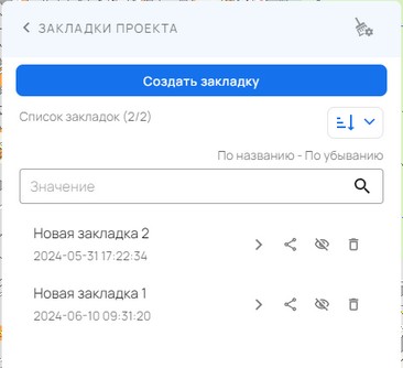 При нажатии на кнопку «Создать закладку» откроется окно подтверждения, где можно изменить имя закладки по умолчанию, далее после нажатия на кнопку «Создать» текущее состояние проекта запишется в БД, и в список закладок панели компонента добавится новая запись. Для списка закладок доступна сортировка по имени или по дате создания, а также поиск.