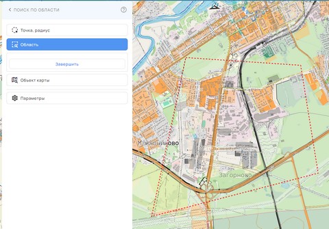 При включении кнопки активируется режим поиска по произвольной области. Необходимо кликом левой кнопки и перемещением мыши на изображении карты выбрать область. При отпускании левой кнопки мыши выполняется поиск объектов. Результат поиска отображается в панели «Объекты карты».