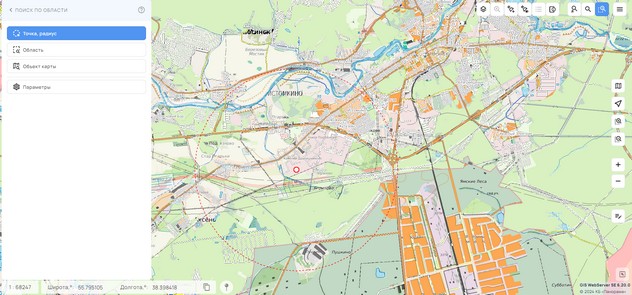 Для выполнения поиска объектов карты в радиусе от заданной точки местности с выбором радиуса необходимо нажать кнопку «Поиск в радиусе от точки». Затем кликом левой кнопки мыши в изображении карты необходимо выбрать точку и, не отпуская кнопки, перемещать указатель мыши для указания радиуса поиска. При отпускании левой кнопки мыши выполняется поиск объектов. Результат поиска отображается в панели «Объекты карты».